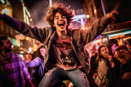 Generative AI : Group of friends enjoying party throwing confetti in the air Multicultural young students having fun celebrating and laughing out loud outdoor Youth friendship an