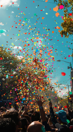 Brightly colored confetti showers a crowd at a lively Cinco de Mayo parade, joy and excitement in the air