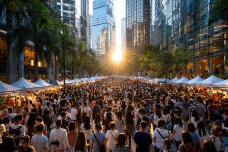 A busy street market features many people exploring festive stalls decorated with colorful lights and banners, creating a lively atmosphere in the city.