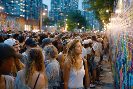 A bustling crowd of people walking down the street at night, filled with revelers and activity, A bustling crowd of revelers in the streets