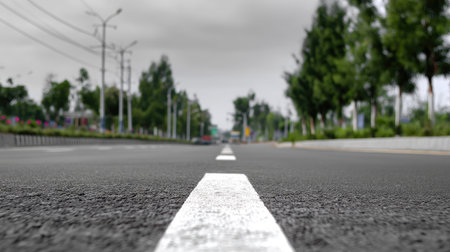 This image features an empty asphalt road surrounded by lush greenery under a cloudy sky, creating a serene atmosphere ideal for urban exploration.