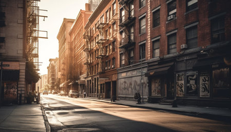 A narrow city street bathed in golden sunlight buildings with lining the street. The sun shines through the buildings casting long shadows on the street.