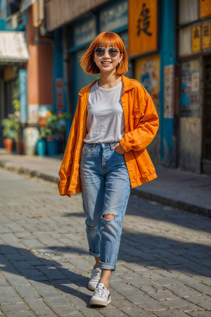 Urban Fashion Display Featuring Young Woman in Colorful Bomber Jacket and Distressed Denim