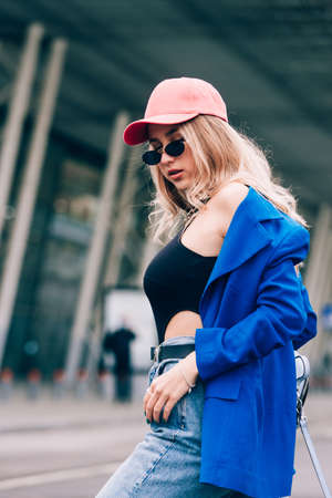 Young sexy blonde hipster woman posing on the street. Wearing blue stylish jacket, jeans and baseball hat and sunglasses.