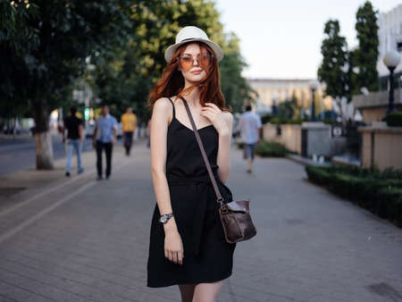attractive woman in a hat outdoors summer posing