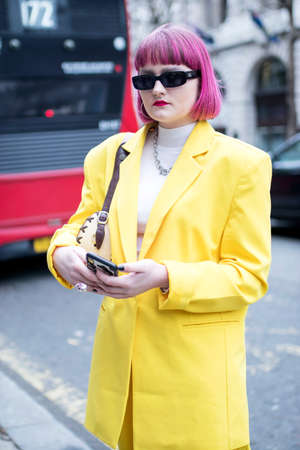 LONDON, UK- febryary 15 2020: Fashionable people on the street . Street style. Girl in a yellow pantsuit and pink hair in sunglasses.