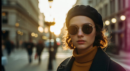 Portrait of a beautiful young woman in sunglasses and a beret on a city street.