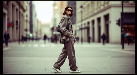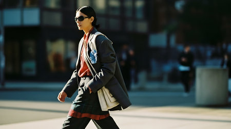 A young woman walking confidently through a bustling city street