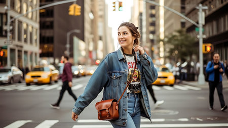 Beautiful young woman crossing the street in New York, wearing a denim jacket and jeans
