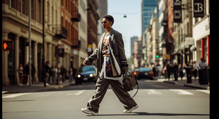 A stylish man walking across a busy city street with tall buildings