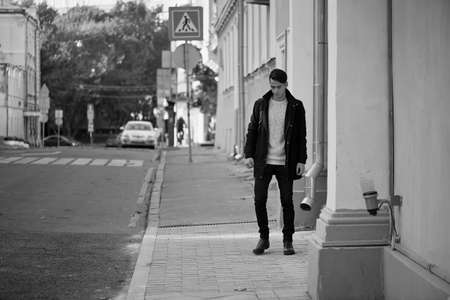 A young man with dark hair and eyes walking down the street. Lifestyle. High growth