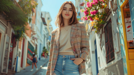 Woman stands confidently on urban street scene.
