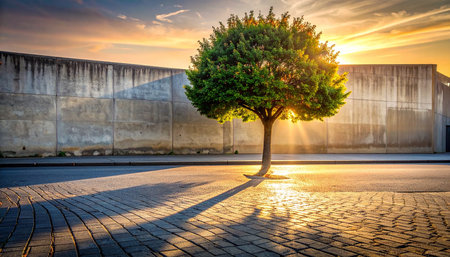 A single green tree casts a long shadow on a cobblestone street with sunburst rays behind it.