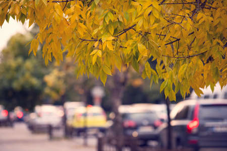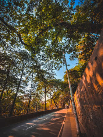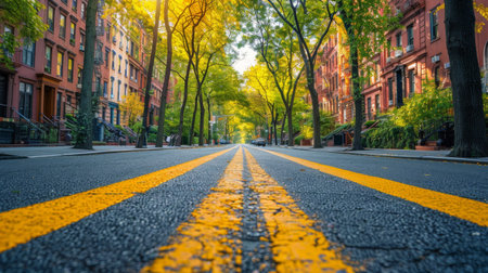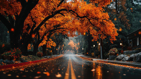 A peaceful empty road in the heart of the city during autumn, adorned with vibrant foliage and scattered leaves. This picturesque urban scene captures the essence of tranquility and seasonal