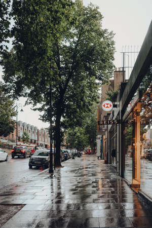 London, UK - July 02, 2020: View of a row of shops on an empty Hampstead High Street in the rain. Hampstead is an affluent residential area of London favoured by artists and media figures.