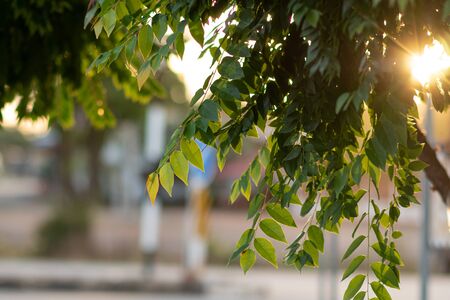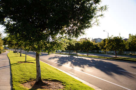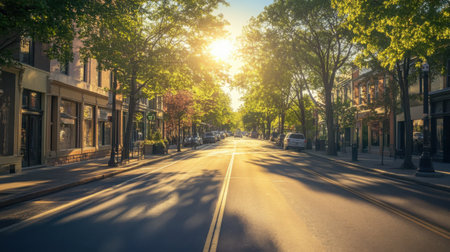 A serene view of a tree-lined street bathed in warm sunlight, evoking a calming atmosphere ideal for leisurely strolls or peaceful drives.