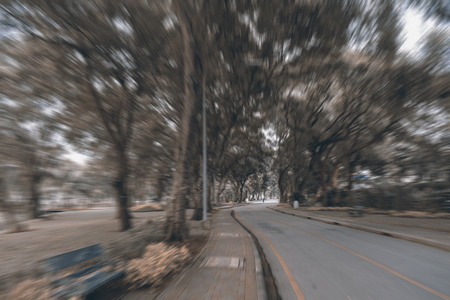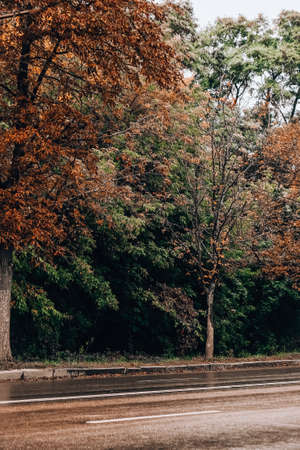 Autumn landscape with a road and a beautiful autumn forest. Magical atmosphere.