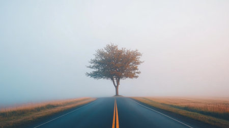 A tranquil roadway stretches into the distance, framed by a solitary tree in a serene, mist-laden landscape, inviting contemplation and exploration.