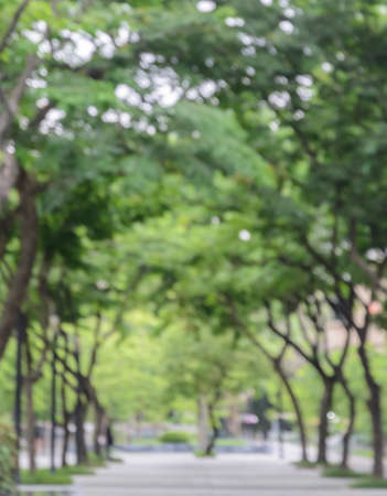 A tranquil pathway flanked by vibrant green trees, offering a peaceful escape in an urban environment, illuminated by soft sunlight filtering through foliage.