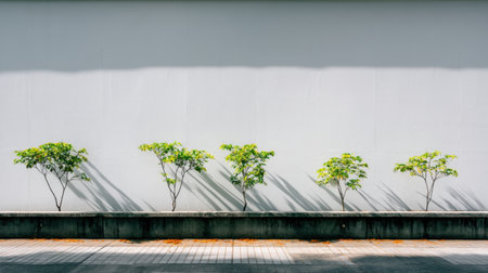 A striking minimalistic urban scene showcasing small green trees casting intriguing shadows against a pristine white wall, embodying modern design and tranquility.