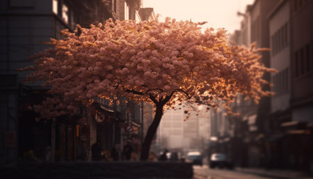 Pink cherry blossom, city skyline, backlit beauty generated by artificial intelligence