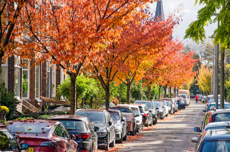 Rotterdam, The Netherlands, October 12, 2020: city street in Hillegersberg neighborhood lined with cherry trees coloring bright red on a sunny day in autumn