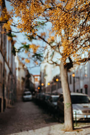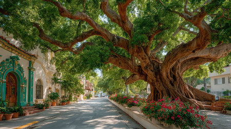 A picturesque urban street lined with majestic trees showcasing vibrant autumn foliage, basking in warm sunlight. A perfect serene moment for city lovers.