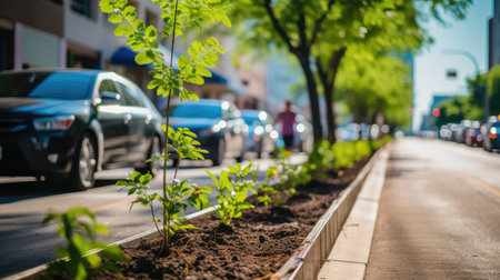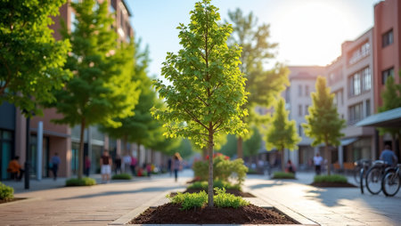 Revitalized urban square with vibrant elm sapling bike racks and pedestrians