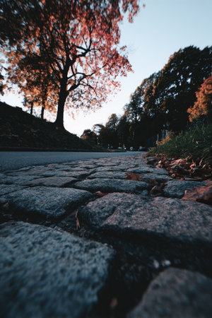 A close-up view showcases a textured cobblestone path leading towards a hillside adorned with a tree displaying red autumn foliage. The composition includes trees in the background with a clear sky above. This image could be utilized for various commercial applications such as website backgrounds or editorial purposes.