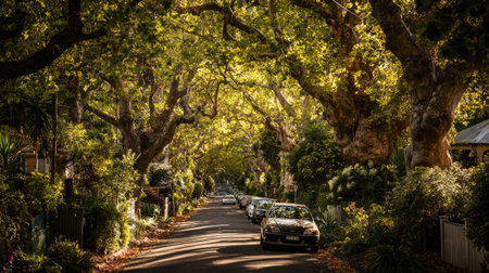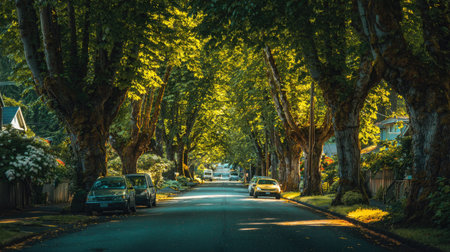 An inviting view features a road shadowed by a canopy of vibrant green trees. Sunlight filters through the foliage, illuminating the street and parked cars. The image presents a natural, daytime setting with rich colors and a calming atmosphere, suitable for editorial and commercial applications.