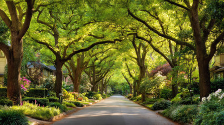 A picturesque street scene featuring a row of mature trees arching over the road, creating a canopy. Sunlight filters through the leaves, casting dappled shadows. The composition emphasizes depth and natural elements, suggesting a residential setting. Suitable for illustrating natural beauty, community, or environmental themes.