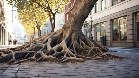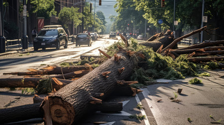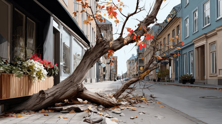 A fallen tree sprawls across the sidewalk, adding a natural touch to an urban landscape. The street is lined with charming buildings, showcasing autumn foliage.