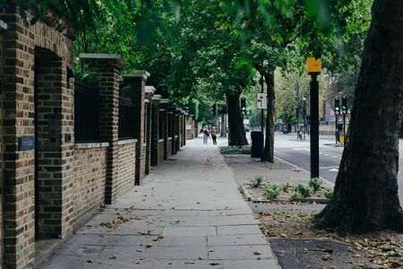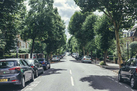 London/UK-30/7/18: Springfield Road with trees and parked cars on the sides of the street in St John's Wood, which is the fifth most expensive affluent neighborhood in London according to Forbes
