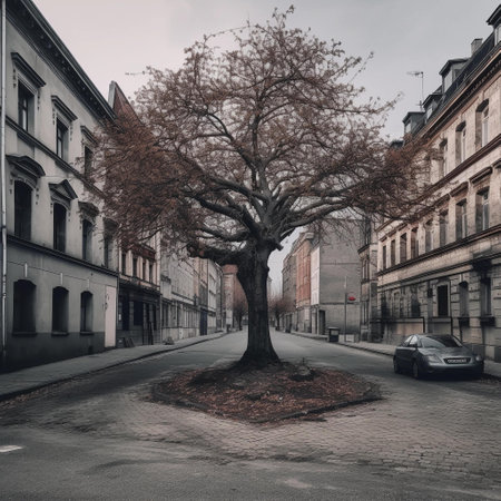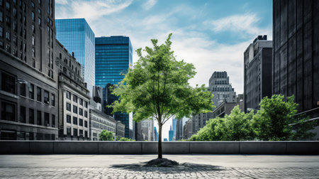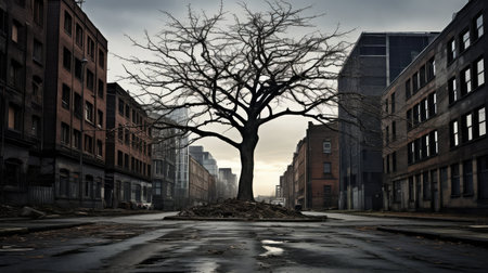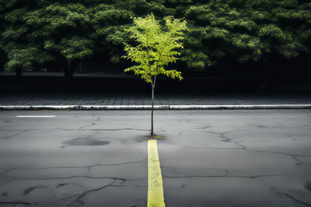 A single green tree breaks through cracked asphalt in an urban street, showcasing nature's resilience amidst city structures. The scene highlights growth and hope.