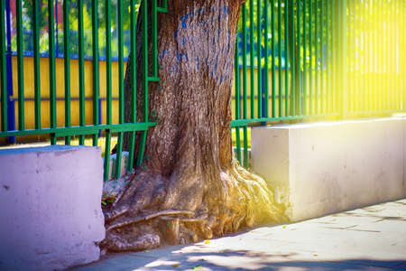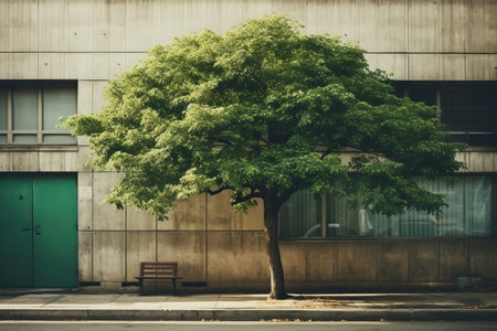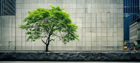 Green tree on the background of a concrete wall of a modern office building. Urbanization and sustainable environment concept