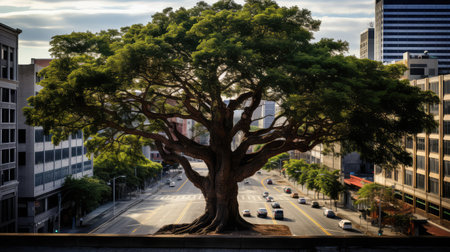 In the heart of a bustling city at night, a luminous tree stands as a beacon of innovation.
