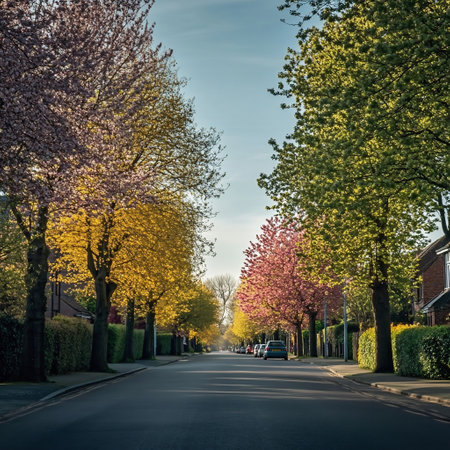 A sunny street in suburbia with rows of houses, colorful front gardens, and green trees forming a perfect canopy.