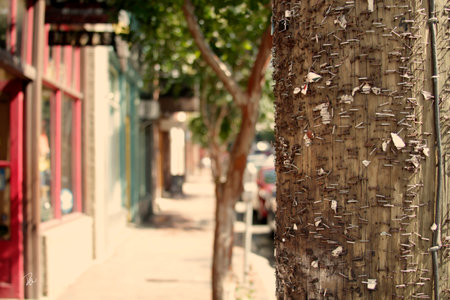 An avenue of trees forms a natural archway over a road, illuminated by sunlight. The scene features parked cars along the sides and offers a view toward the distant buildings. The style is naturalistic with vivid colors. This image could be suited for various purposes, like illustrating travel or natural beauty.
