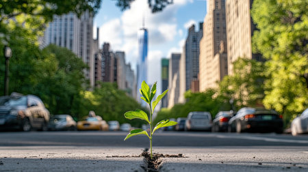 A small green plant emerges through a crack in the concrete, symbolizing resilience and growth in an urban landscape against a towering city skyline.