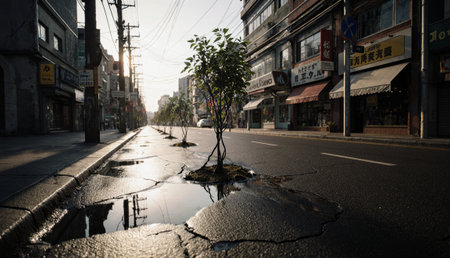 Small trees grow from cracks in the pavement, symbolizing resilience and nature's persistence. The early morning light casts a warm glow on storefronts in a quiet city street.