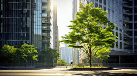 A street flanked by towering buildings and leafy trees, creating a harmonious blend of urban and natural elements.
