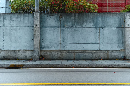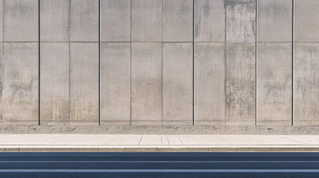 A minimalist urban scene featuring a textured concrete wall and a clean sidewalk. The design emphasizes simplicity and modern architecture in an outdoor setting.