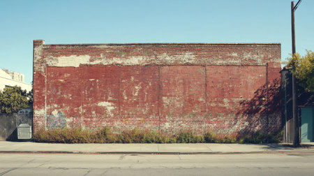 A weathered red brick wall stands along a city street partially covered by green plants under a clear blue sky.