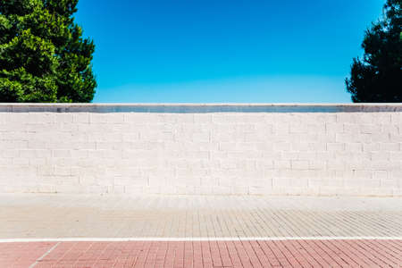 An urban minimalist scene, a white wall in the sun with two trees and blue sky.