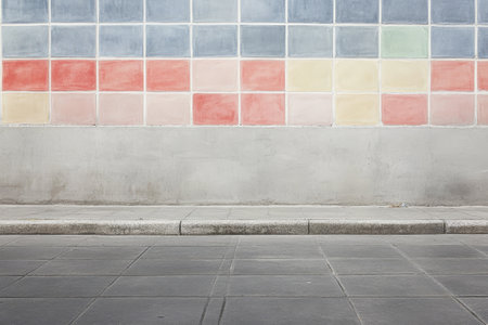 A vibrant wall featuring a grid of colorful tiles stands against a plain sidewalk under clear blue skies. The scene captures the essence of urban aesthetics during a calm day.