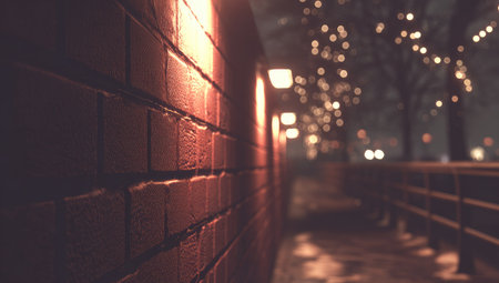A brick wall is bathed in warm light, casting shadows across the surface. The image displays a blurred background with bokeh effects suggesting street lights and distant objects. The scene hints at an urban environment at dusk or night, suitable for commercial and editorial purposes.