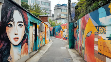 Alley in Hongdae showcasing murals themed around Korean culture and history.