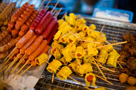 Fresh asian spicy crispy chicken sausage bites on local market in Krabi. Traditional thai cuisine made of fresh ingredients.