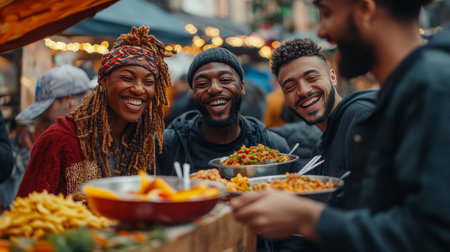 A joyful group of friends shares a delightful meal of diverse street food dishes in a vibrant outdoor setting, showcasing warmth and camaraderie.