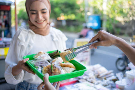 a girl in a veil give a plastic tray of takjil food to seller at a roadside stall